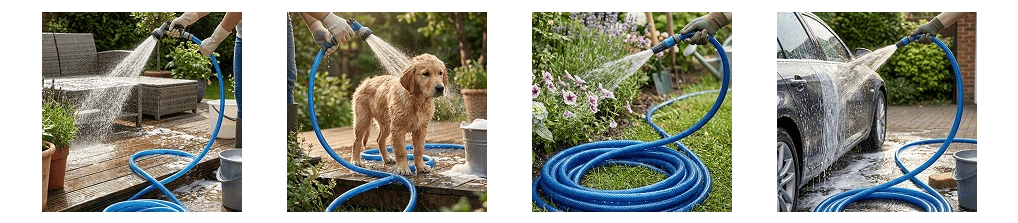 - Господарські та побутові роботи — підключення до кранів, насосів, розпилювачів