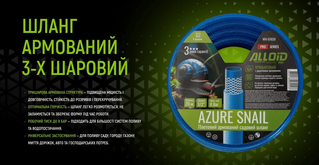 Садовий шланг Alloid Pro AZURE SNAIL — тришаровий армований шланг із ПВХ діаметром 1/2″ і довжиною 20 м для щоденного поливу та господарських робіт. Тришарова конструкція з армувальним шаром забезпечує стійкість до внутрішнього тиску до 8 бар, захищає від заломів, розривів і перекручування навіть при активному використанні. Шланг легко розмотується, зберігає форму під час роботи та не перегинається у місцях з’єднань.