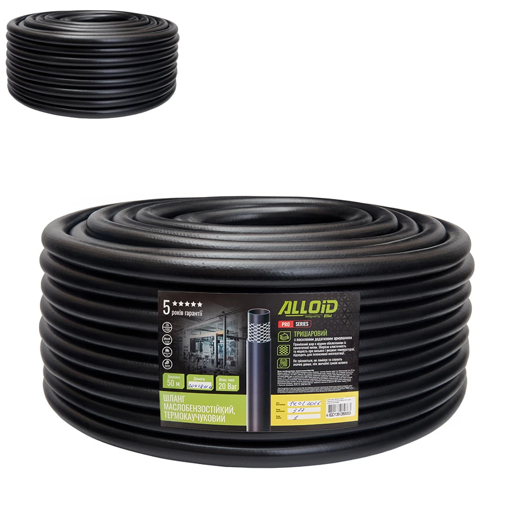 Шланг маслобензостійкий Alloid Pro GR-67696 — флагманська модель у лінійці термокаучукових шлангів від Alloid Pro з найбільшим внутрішнім діаметром 20 мм і зовнішнім 28 мм, намотана у зручну бухту 50 метрів. Збільшений діаметр забезпечує максимальну пропускну здатність серед усіх шлангів серії, що робить його незамінним для інтенсивного промислового використання, стаціонарних систем перекачування та потужних насосних установок. Робочий тиск до 20 бар дозволяє шлангу витримувати значні механічні та гідравлічні навантаження в безперервному режимі роботи.