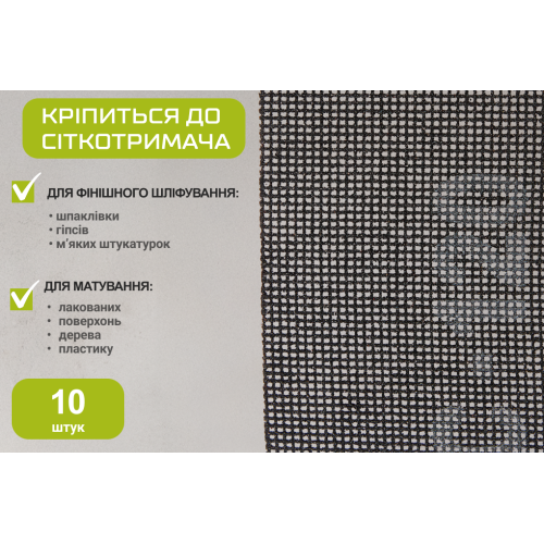 Сітка виготовлена з міцного абразивного полотна, яке не рветься й не ламається в процесі роботи. Завдяки структурі з отворами абразив не забивається пилом, що подовжує ресурс кожного аркуша. Надійно фіксується на терці й забезпечує рівномірне шліфування без перегріву.