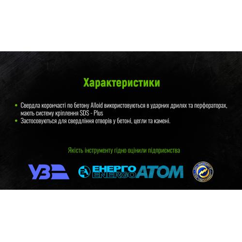 Корончате свердло Alloid діаметром 30 мм з адаптером SDS Plus (110 мм) призначене для швидкого та точного свердління отворів у бетоні, цеглі, природному камені та газобетоні. Побідитові ріжучі елементи забезпечують високу продуктивність і зносостійкість, а кріплення SDS Plus гарантує надійну фіксацію та ефективність роботи з перфоратором.