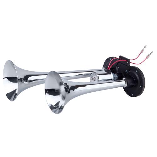 Конструкція складається з двох металевих дудок із хромованим покриттям, стійка до вологи, корозії та механічних пошкоджень. Підходить для встановлення на легкові авто, вантажівки, автобуси, спецтехніку. У комплекті — електромагнітний клапан та кріплення, що спрощує монтаж.