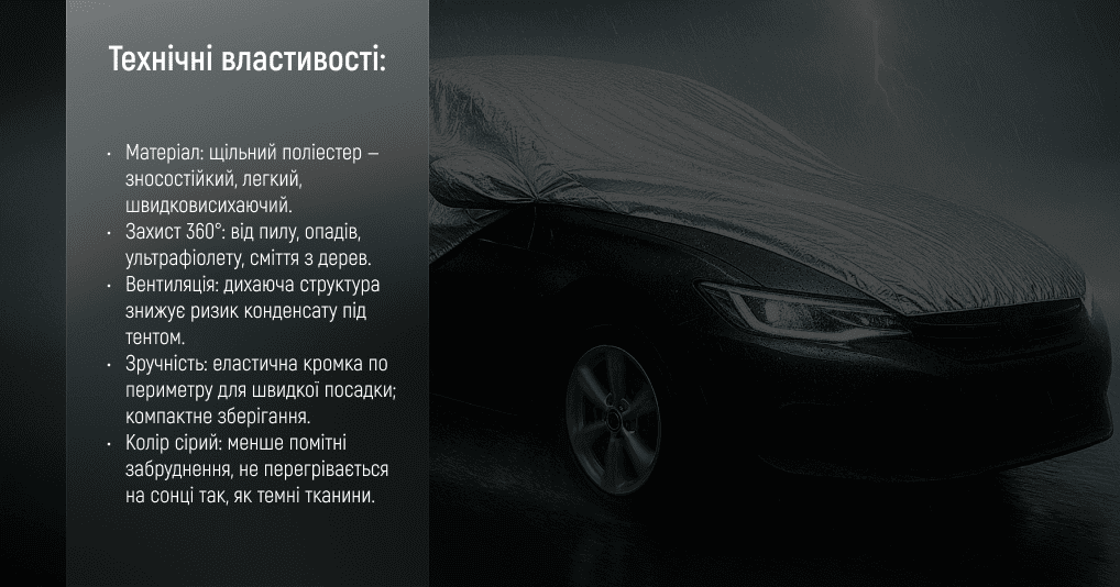 Легкий всесезонний тент для стоянки під відкритим небом і в гаражі. Захищає кузов від пилу, дощу/снігу, пташиного посліду, листя та УФ-випромінювання, зменшує вигоряння лаку й інтер’єру. Сірий поліестер швидко сохне, не вбирає бруд і компактно складається.