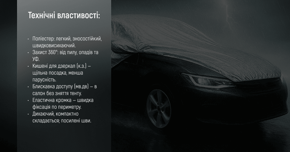 - Накривайте чистий і сухий кузов: змийте/зметіть пил, складіть дзеркала, зніміть антену/гострі аксесуари.