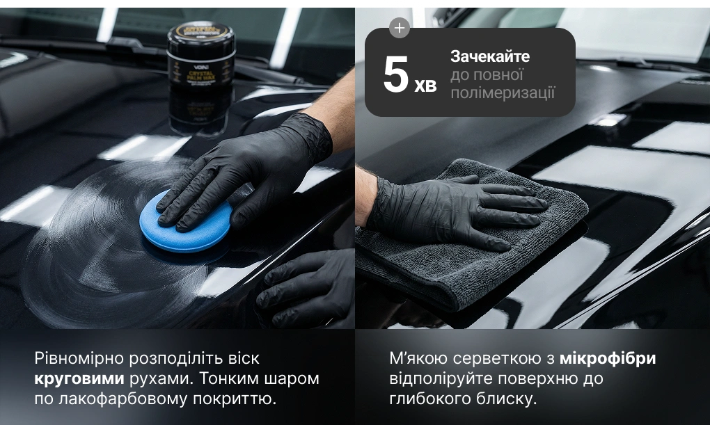 Натуральний віск Carnauba формує щільний та рівномірний захисний шар, який допомагає зберегти зовнішній вигляд кузова. Оброблена поверхня стає гладкою, що зменшує налипання бруду та води і спрощує подальший догляд. Засіб рівномірно розподіляється без розводів і плям та є безпечним для пофарбованих поверхонь. Комплектний аплікатор дозволяє контролювати процес нанесення, а мікрофібра забезпечує акуратний фініш без ризику мікроподряпин.