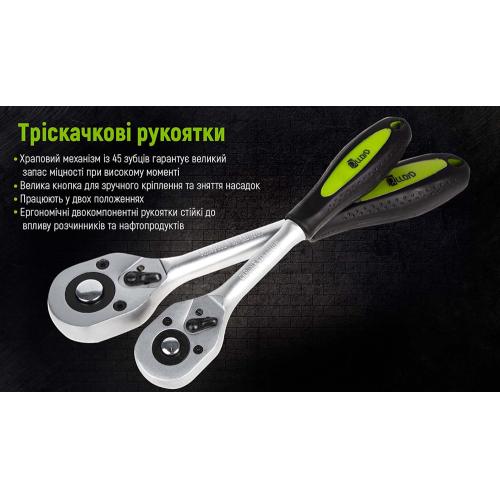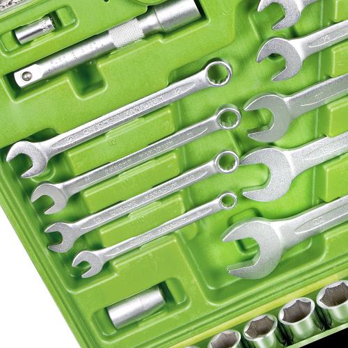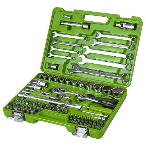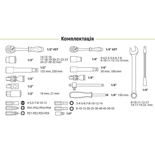 У наборі міститься 82 одиниці інструментів, які дозволяють виконувати більшість завдань в автомайстерні. У комплекті є все необхідне для ремонту — від тріскачок на квадрати 1/2” та 1/4” до великого вибору гайкових ключів, головок та біт різних типів.