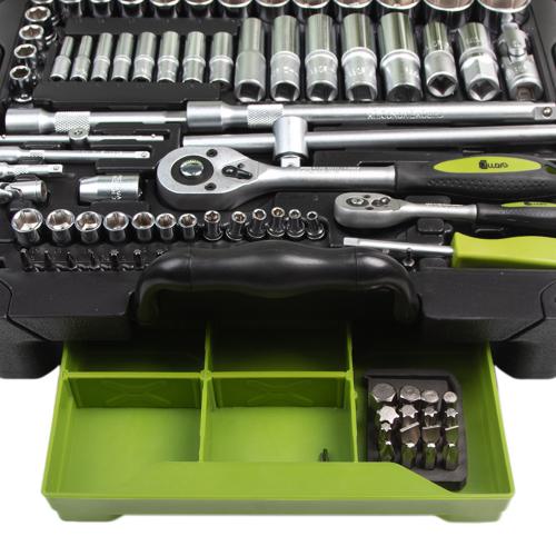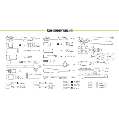 У наборі міститься 115 одиниць інструментів, які дозволяють виконувати більшість завдань в автомайстерні. У комплекті є все необхідне для ремонту — від тріскачок на квадрати 1/2” та 1/4” до великого вибору гайкових ключів, головок різних типів та біт.