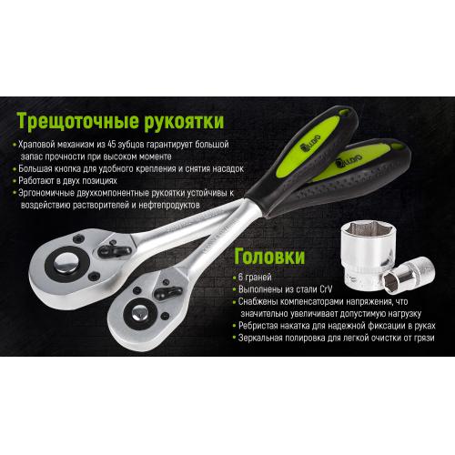 Головки виготовлені з високоякісної легованої хромованадієвої сталі та мають трьошарове покриття. Інструмент здатний витримати великі навантаження. Також, головки обладнані компенсатором напруги та легко очищаються завдяки дзеркальному поліруванню поверхні.