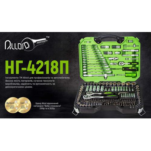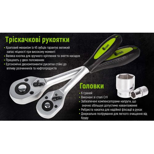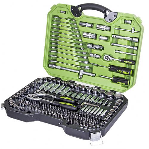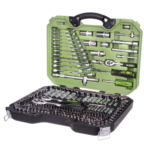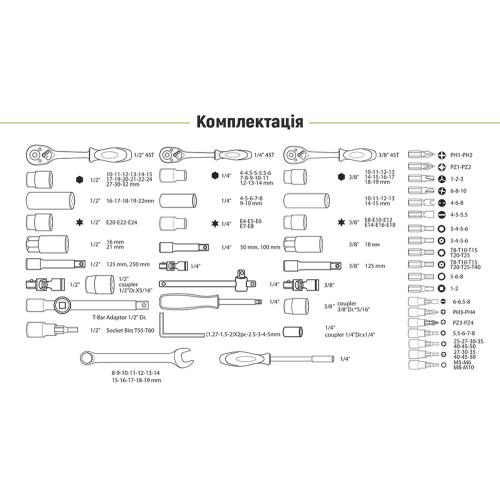 У наборі міститься 218 одиниць інструментів, які дозволяють виконувати більшість завдань в автомайстерні. У комплекті є все необхідне для ремонту — від тріскачок на квадрати 1/2” та 1/4” до великого вибору гайкових ключів, головок різних типів та біт.
