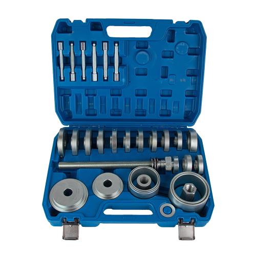 Комплект включає 31 високоточну деталь — оправки, плити, болти, гайки, направляючі втулки — усе, що потрібно для безпечної роботи з маточинними підшипниками без пошкоджень. Зберігається в міцному кейсі.